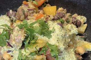 A fiber rich dense bean salad with marinated steak and a creamy jalapeño dressing